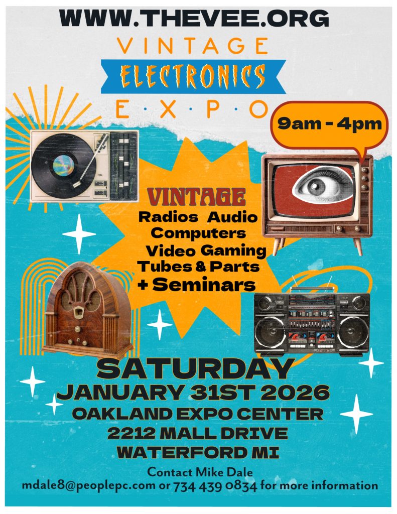 We had a great time at the Vintage Electronics Expo in Kalamazoo in October. Our next Vintage Electronics Expo will be January 31, 2026, and will be held again at the Oakland Expo Center on Telegraph in Waterford. The address is 2212 Mall Drive. Last year’s event was amazing, we hope to top it!! Watch this space for vender info, coming soon!!